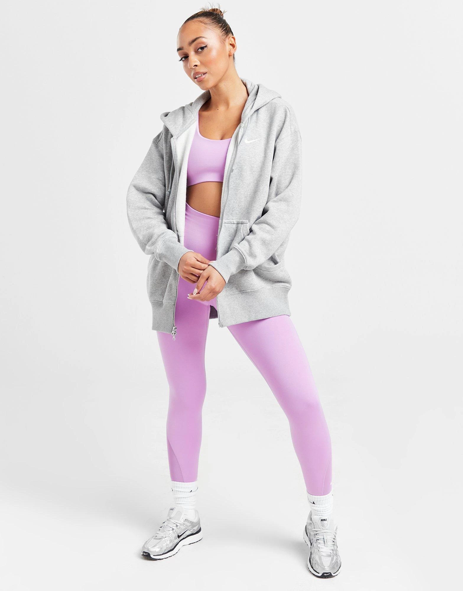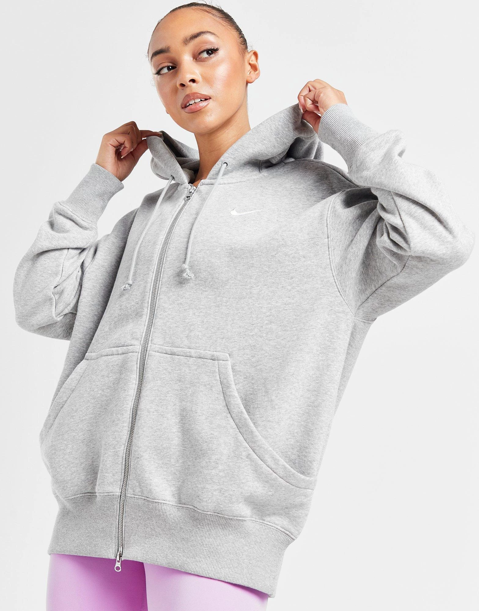 Elevate your off-duty vibes with this women’s Phoenix Fleece Oversized Full Zip Hoodie from Nike. Landing in a Dark Grey Heather colourway, this roomy hoodie is built using a cotton poly blended fleece fabric that’s super-soft and fuzzy for all-day comfort. It features full zip fastening with a 4-panel adjustable hood for custom coverage ribbed trims for an extra snug feel. With a split kangaroo pocket to keep your essentials stored, it’s signed off with the Swoosh to the chest. Machine washable. | Our model is 5’6″ and wears a size small.