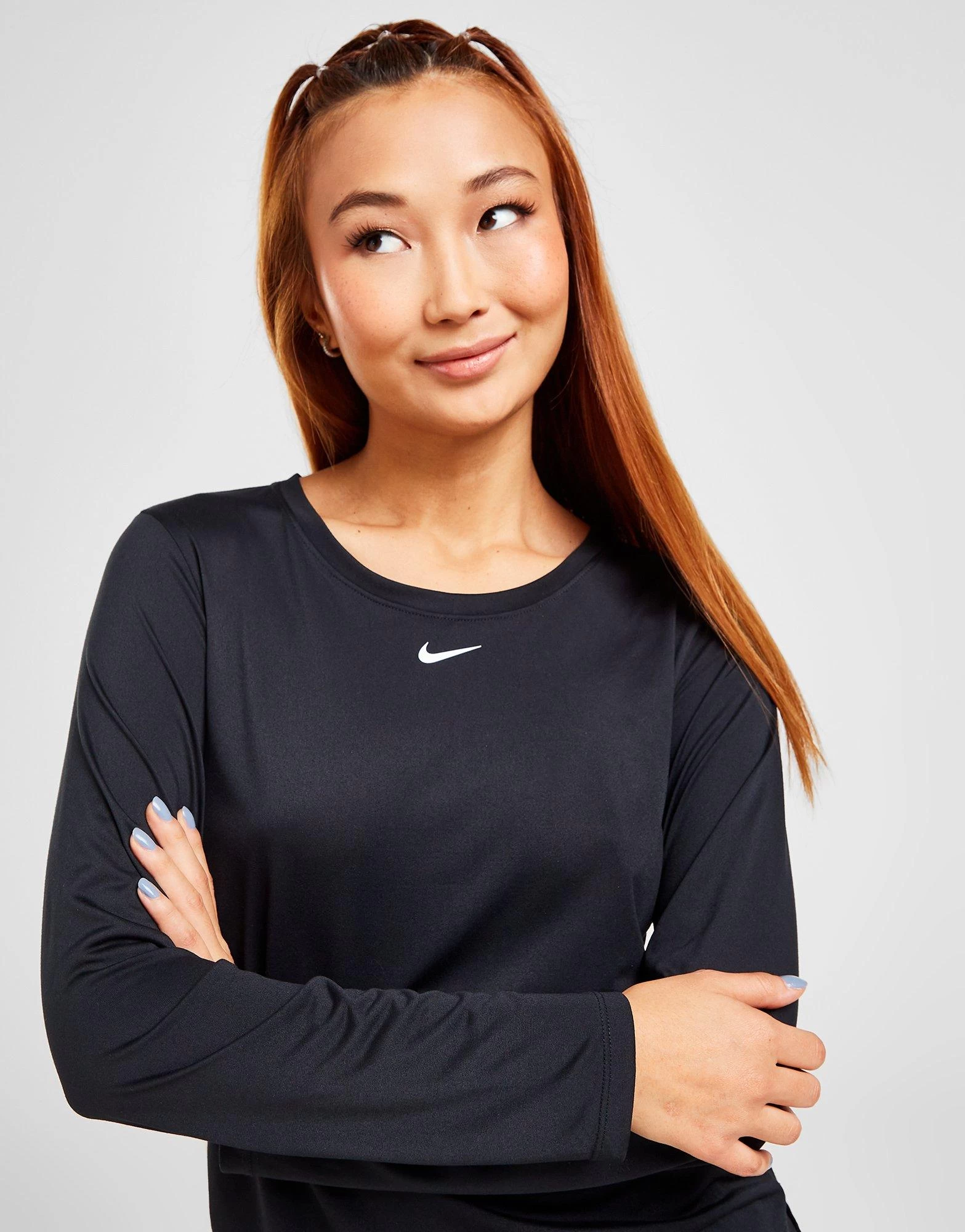 Whether you’re hittin’ the gym or tearing up the track, check out this women’s Training One Long Sleeve Top from Nike. In a Black colourway, this top is made using light, breathable polyester for a cool, comfy feel as you workout. It features Nike Dri-FIT sweat-wicking tech to keep you dry and in the zone throughout your sesh, while the long sleeves provide extra coverage when needed. In a standard-fit for a relaxed wear, this top is finished up with a Nike Swoosh to the chest. Machine washable | Our model is 5’7″ and wears a size small.